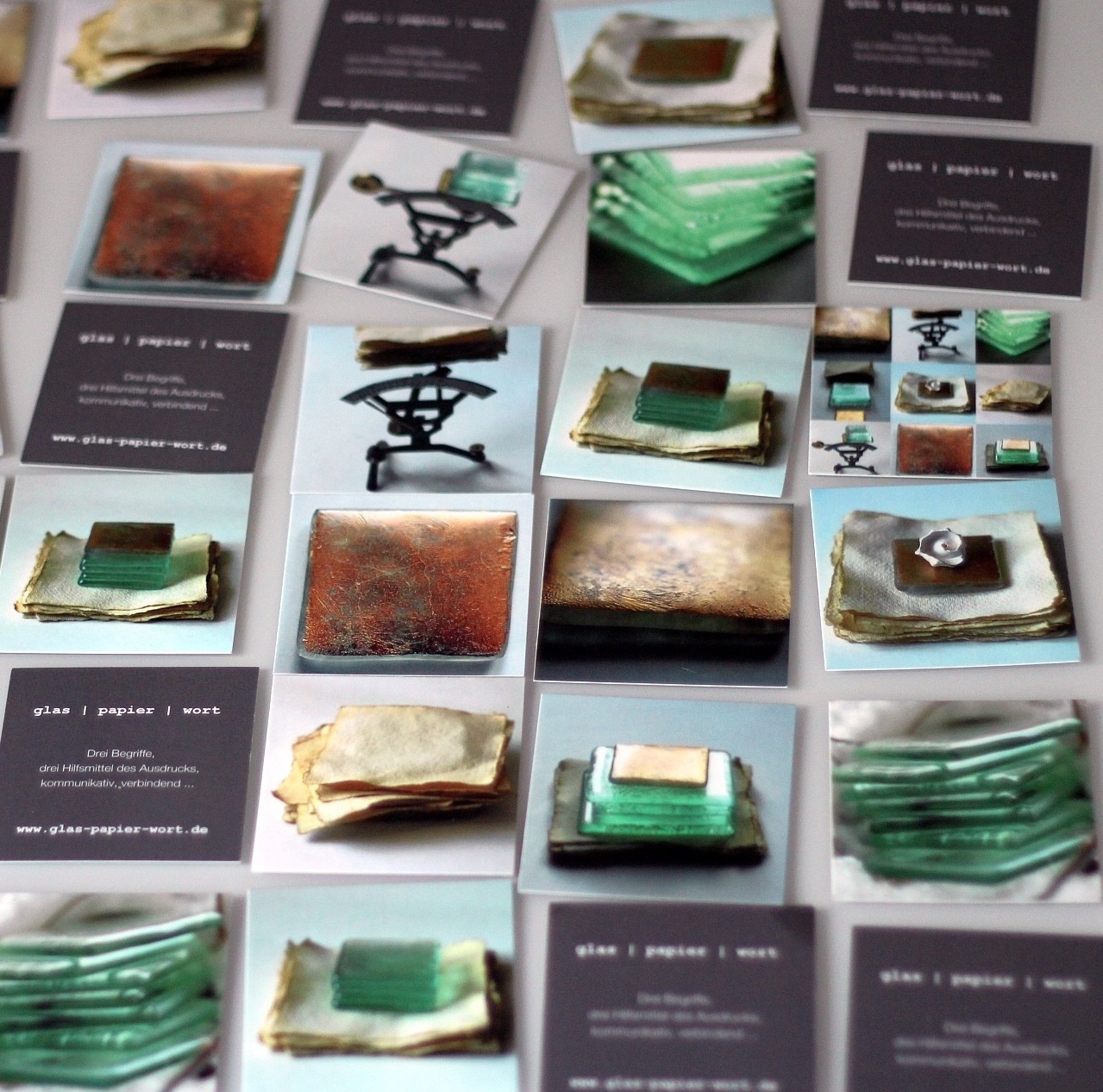 Ich suchte im Papier das Glas und im Glas das Papier. So entstand ein Dialog, zunächst innerlich, dann spielerisch nach außen getragen – im eigentlichen Spiel. Was hat Papier mit Holz zutun, und warum ist Asche Teil des Glases. Was wiegen vier oder fünf Scheiben Glas und was vier oder fünf Blatt Bütten. Ist eine Feder leichter als ein Blatt Papier und warum ist das Glas grün, obwohl es durchsichtig ist. All das findet sich in diesen Karten. Hier zeige ich eine Auswahl. Bei Interesse schreiben Sie mir gern.