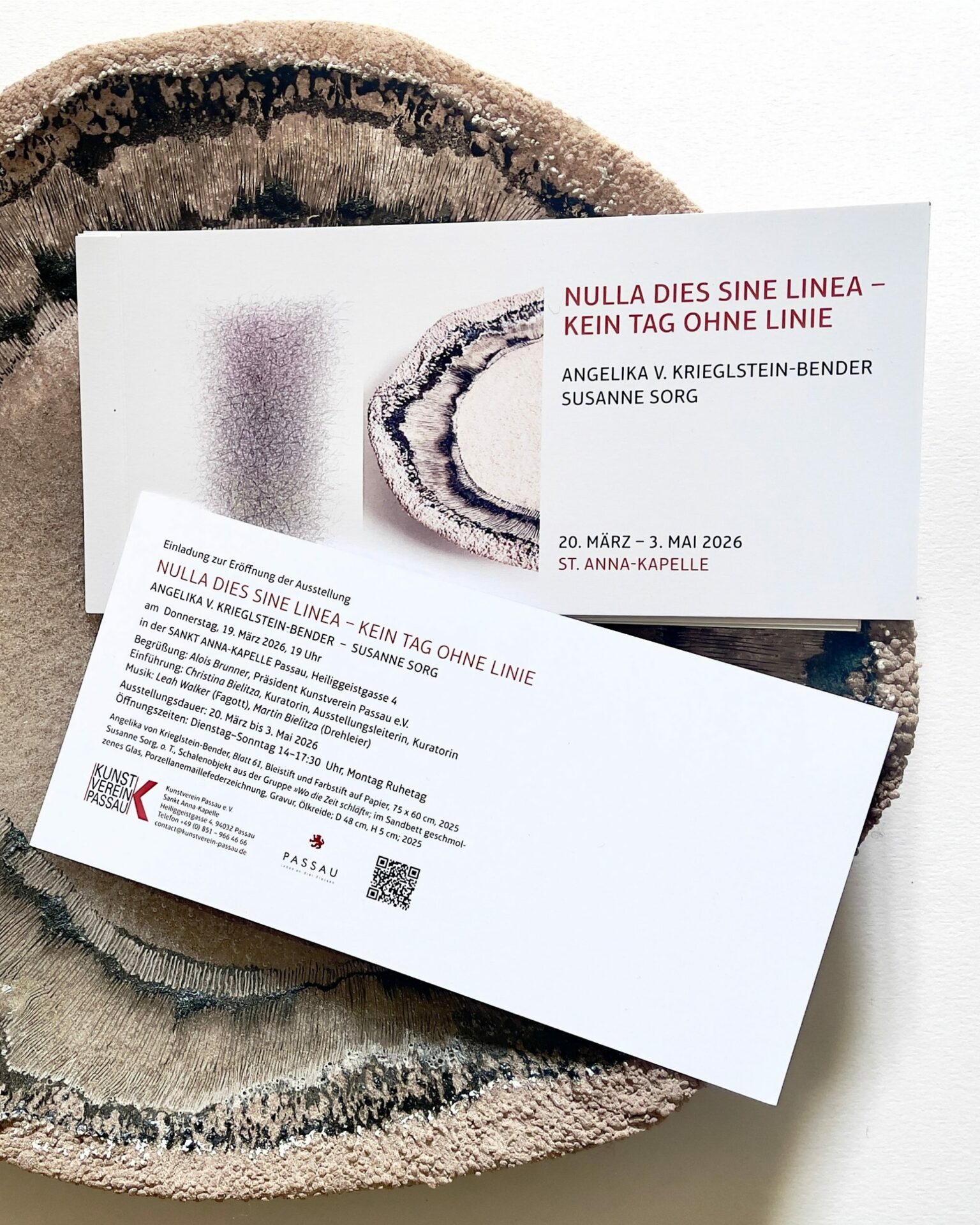 Noch bis Sonntag, 3. Mai 2026, 17 Uhr ist die Ausstellung „Nulla dies sine linea – kein Tag ohne Linie“ mit Werken von Angelika von Krieglstein-Bender und Susanne Sorg in der Sankt Anna-Kapelle in Passau geöffnet. Informationen HIER