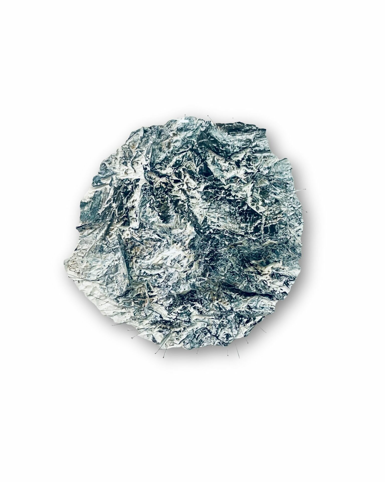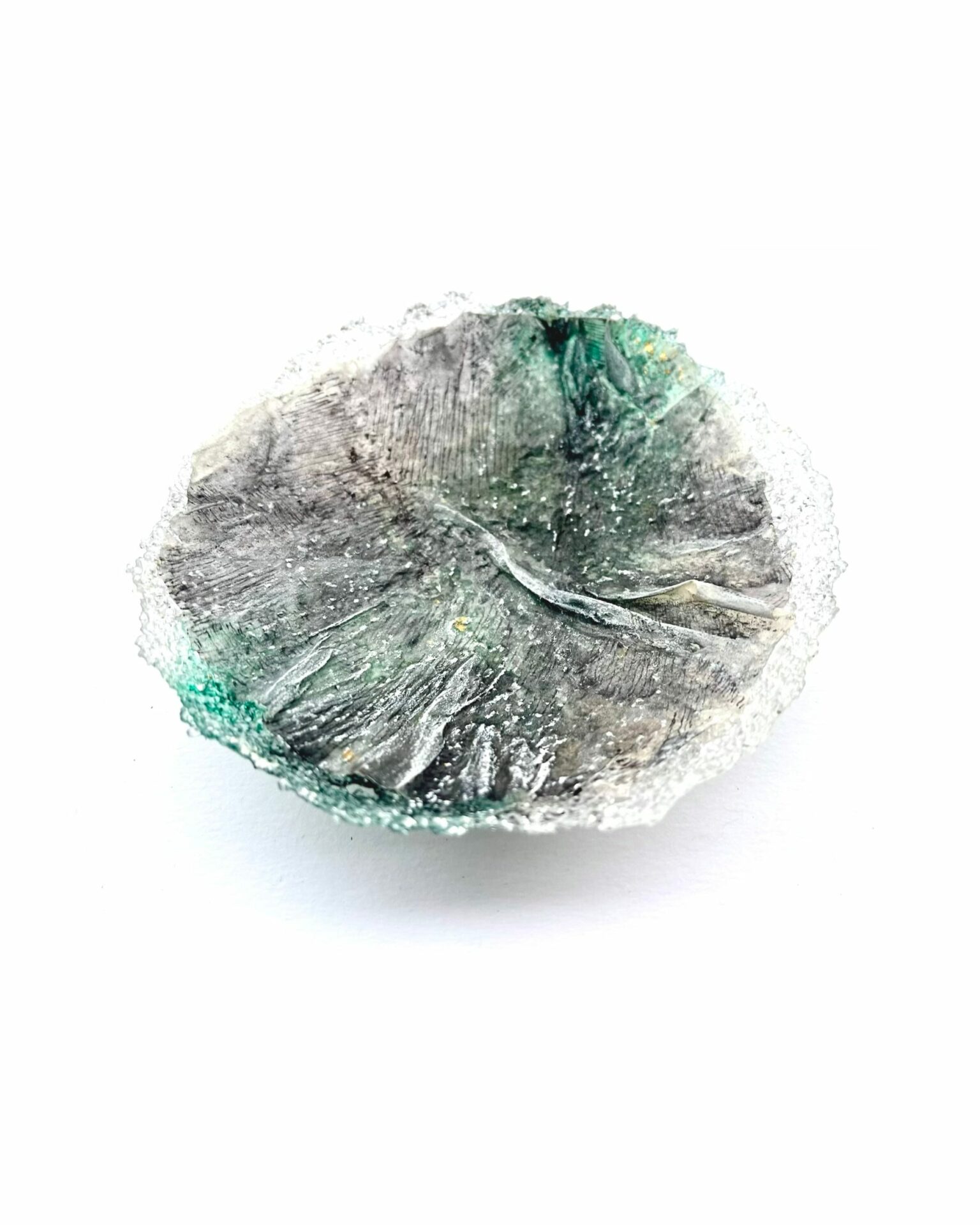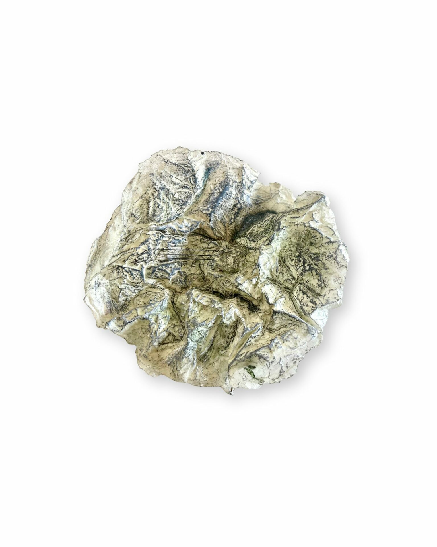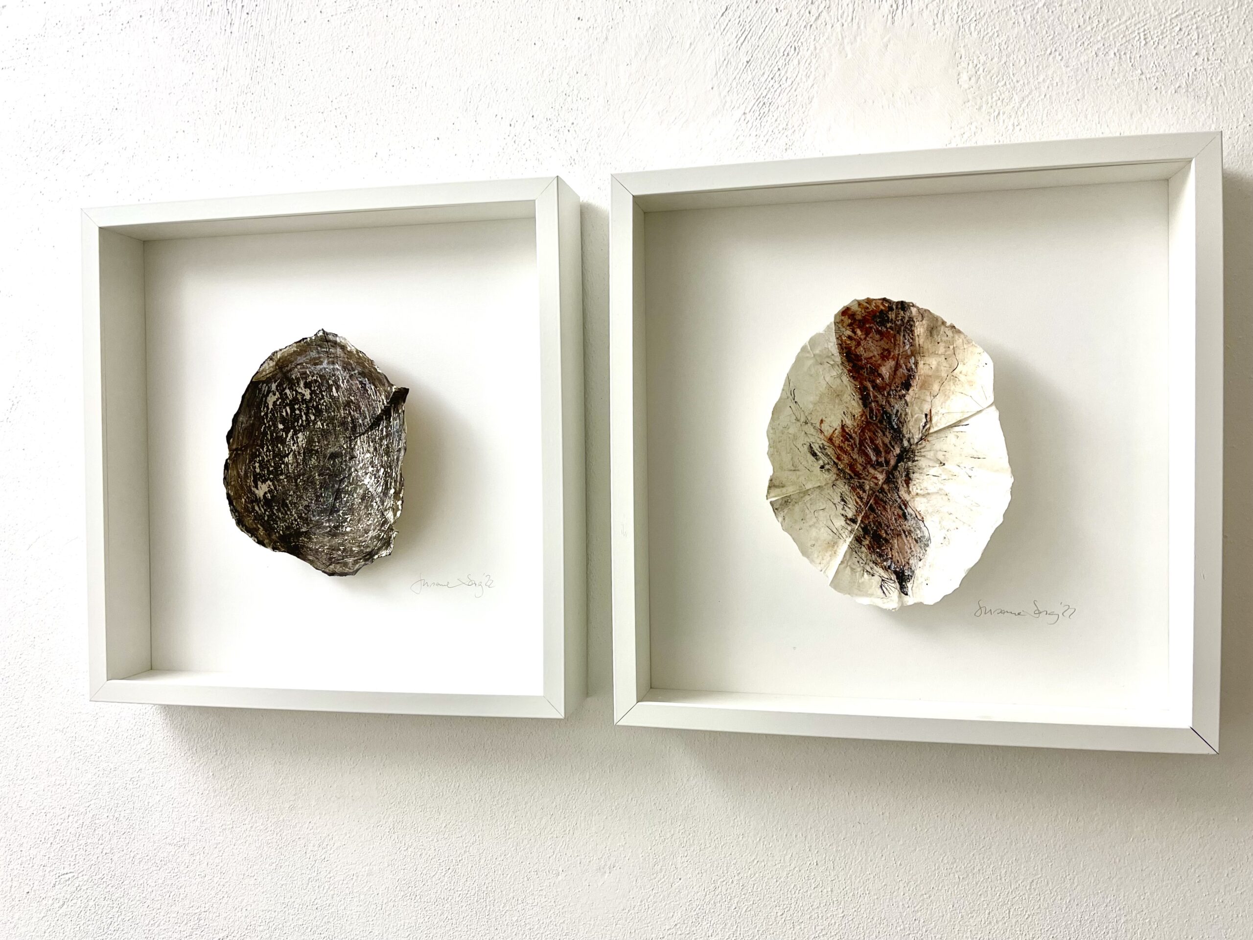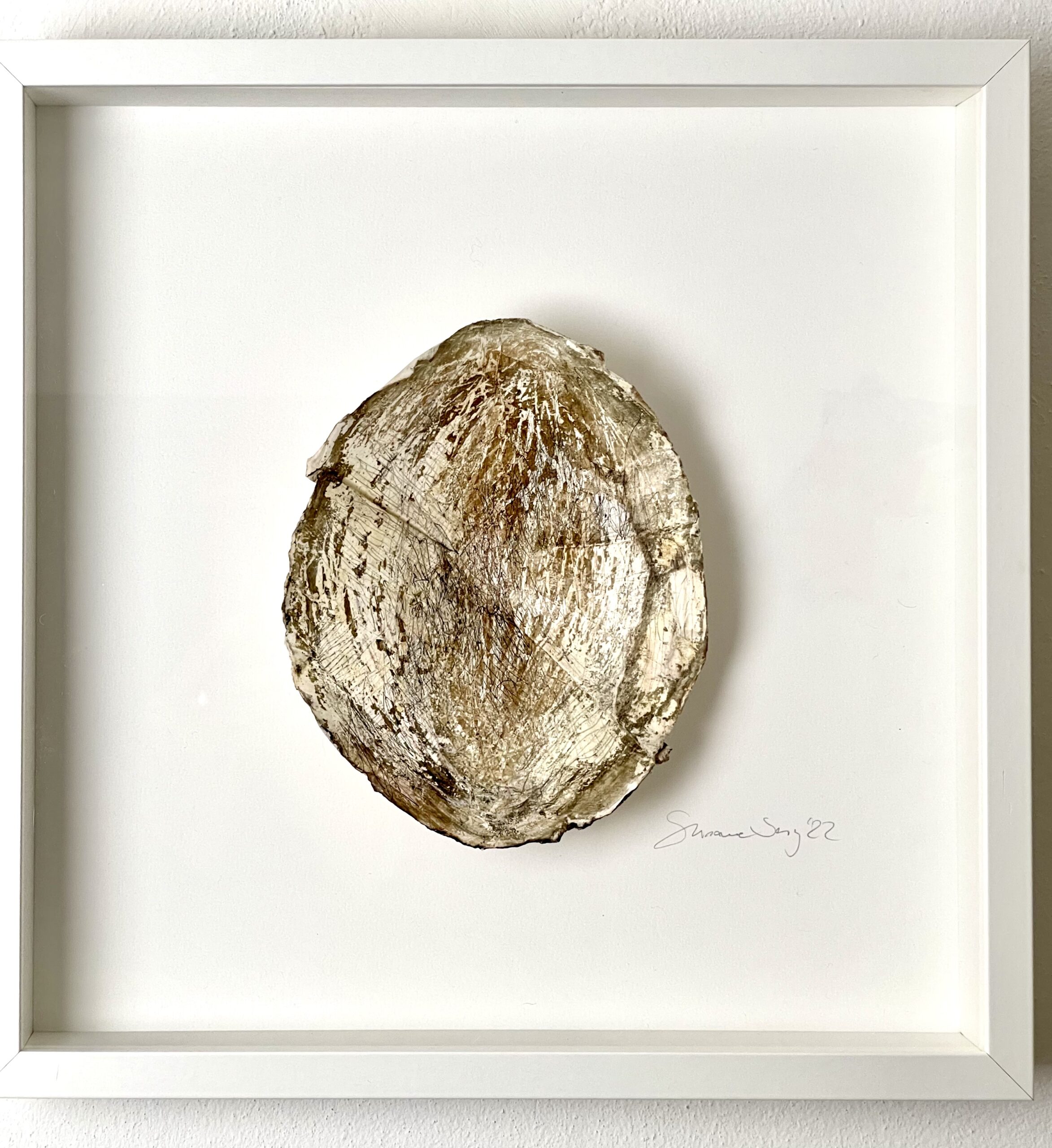 Mit Glaspuder geschichtetes und mit Schellack verdichtetes und geformtes Papier, gestaltet mit Schellacktusche und Ölkreide, auf Bütten, gerahmt.